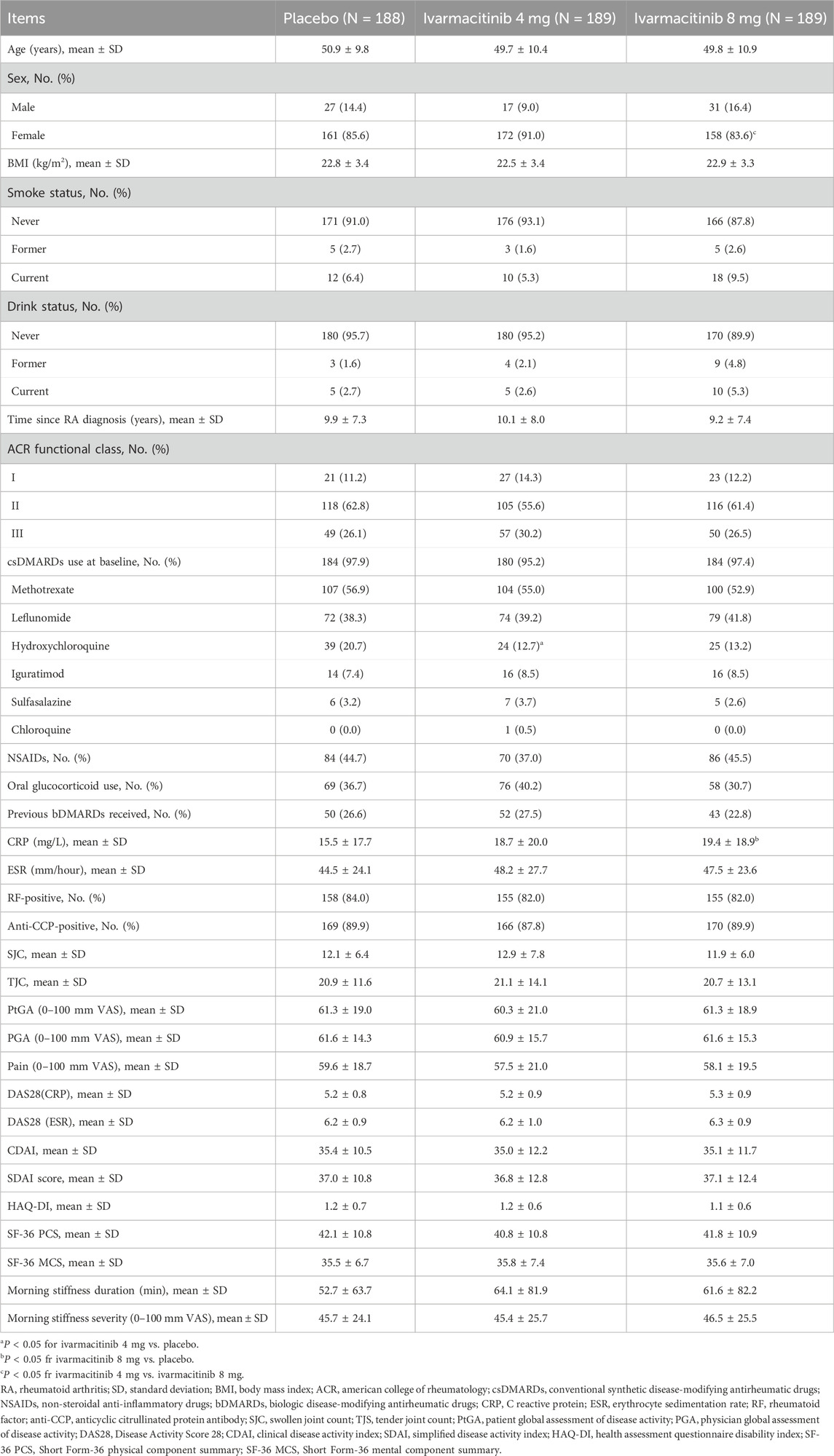 The baseline characteristics of the three groups are reported previously (Liu et al., 2025). The placebo, ivarmacitinib 4 mg, and ivarmacitinib 8 mg groups had a mean age of around 50 years, with over 80% of patients being females. The RA duration of the three groups was over 9 years. In the placebo, ivarmacitinib 4 mg, and ivarmacitinib 8 mg groups, 97.9%, 95.2%, and 97.4% patients were using csDMARDs at baseline; while the rates were 44.7%, 37.0%, and 45.5% for NSAIDs. The rates of baseline glucocorticoids usage rates were 37.6%, 40.2%, and 30.7% in the three groups, respectively. The baseline demographic characteristics and disease features were generally balanced among the three groups (Table 1). However, the proportion of patients with hydroxychloroquine usage at baseline was lower in ivarmacitinib 4 mg group than in the placebo group.
