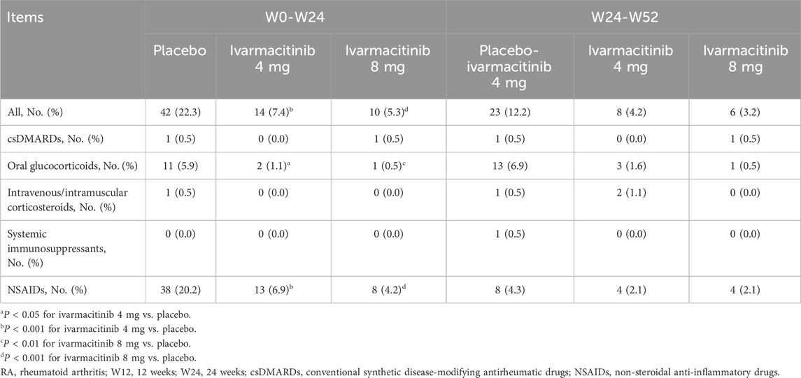 Results: Ivarmacitinib 4 mg (7.4%) and 8 mg (5.3%) groups had significantly lower rates of adding/escalating medication compared to the placebo group (22.3%) within W24 (both P < 0.001). Specifically, the ivarmacitinib groups presented lower rates of adding/escalating oral glucocorticoids (1.1% and 0.5%, versus 5.9%) and non-steroidal anti-inflammatory drugs (6.9% and 4.2%, versus 20.2%) than the control group within W24. No statistical significance was observed between groups in adding/escalating intravenous/intramuscular corticosteroids, conventional synthetic disease-modifying antirheumatic drugs, or systemic immunosuppressants. From W24 to W52, the rates of adding/escalating medications remained low in ivarmacitinib 4 mg (4.2%) and 8 mg (3.2%) groups; the switched group showed a reduced rate of adding/escalating medications (12.2%).