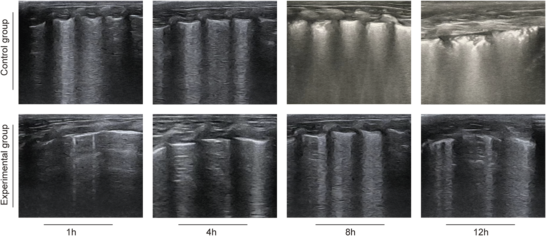 Compared with the control group, the MLUS scores of the experimental group at 4 H, 8 H and 12 H were significantly lower, and the differences between them were statistically significant (P < 0.05), as shown in Table 3. Representative MLUS images are shown in Figure 1. In the control group, the number and density of vertical hyperechoic artifacts (B-lines) progressively increased over time, with partial fusion and “white-lung” appearance observed at 8–12 h, indicating worsening pulmonary edema and alveolar–interstitial syndrome. In contrast, in the deslanoside-treated experimental group, fewer and thinner B-lines were observed, with better pleural line continuity and less ultrasonic evidence of interstitial fluid accumulation. These qualitative imaging findings are consistent with the quantitative MLUS scores, further confirming that deslanoside effectively alleviated pulmonary edema and improved lung aeration in rabbits with ALI.