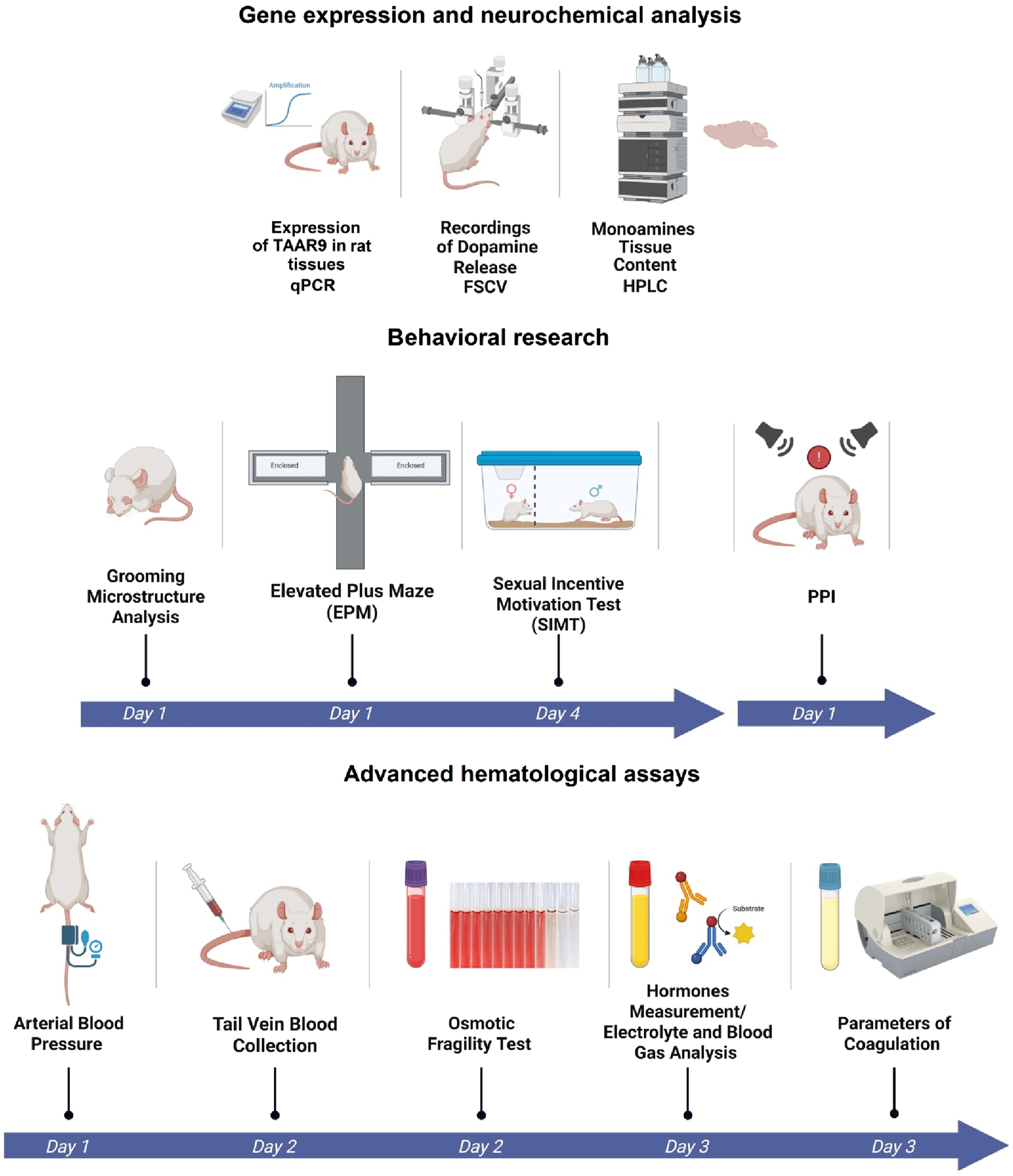 Experimental design of comparative analysis between WT and TAAR9-KO rats. Broad characterization included: evaluation of Taar9 expression in Sprague-Dawley rats, neurochemical and behavioral experiments and advanced hematological assays.
