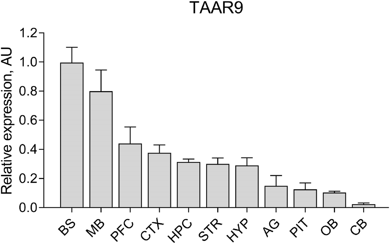 Relative expression levels of Taar9 in rat brain and adrenal gland samples shown in arbitrary units (AU). The mRNA expression levels of Taar9 were measured by qPCR in tissues of Sprague-Dawley (SD) rats and normalized to the expression of the housekeeping gene TATA-box binding protein (TBP) on a per sample basis (n = 3 wild-type SD rats). BS, brainstem; MB, midbrain; PFC, prefrontal cortex; CTX, cortex; HPC, hippocampus; STR, striatum; HYP, hypothalamus; AG, adrenal glands; PIT, pituitary gland; OB, olfactory bulb; CB, cerebellum.