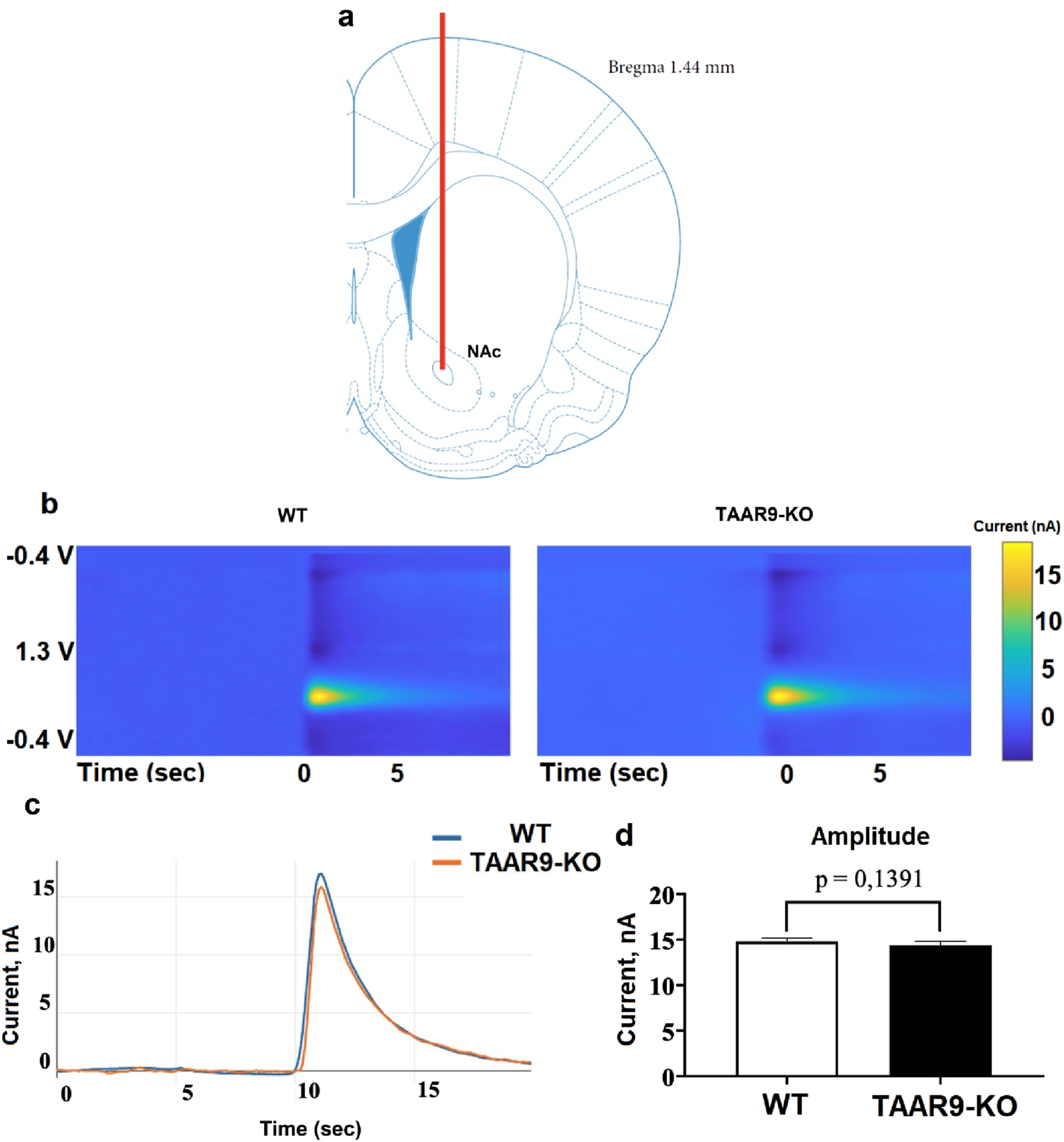TAAR9 knockout does not affect induced mesolimbic dopamine release in rats. Using fast-scanning cyclic voltammetry (FSCV), the secretory activity of dopaminergic neurons was assessed in WT and TAAR9-KO rats based on the change in the level of dopamine in the intercellular space of the nucleus accumbens (NAc) in response to electrical stimulation of the ventral tegmental area (VTA) in vivo. (a) shows the position of the measuring electrode in the core region of NAc, (b) depicts representative color plots of the redox potentials which signify current in nanoamperes (nA) at the given voltages (V) across time in seconds (sec), (c) shows the mean signals of these color plots (n = 4 per genotype), and (d) reports the mean peaks ±SEM of these signals; the difference between these peaks was not significant as per the Mann–Whitney U-test (p > 0.05).
