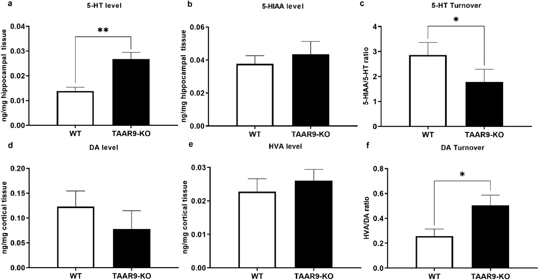 TAAR9 knock out alters the levels of monoamines and their metabolites in the rat brain. Hippocampal levels of 5-HT (p = 0.0030) and turnover (5-HIAA/5-HT) ratio (p = 0.0350) significantly differed across genotypes (a–c), whereas changes in the cortical levels of DA and HVA did not reach significance (d,e), despite a significant change in cortical dopamine turnover (f) (HVA/DA ratio, p = 0.0328). All data are presented as mean ± SEM (n = 11 per group). * p < 0.05, ** p < 0.005, Mann–Whitney U-test.