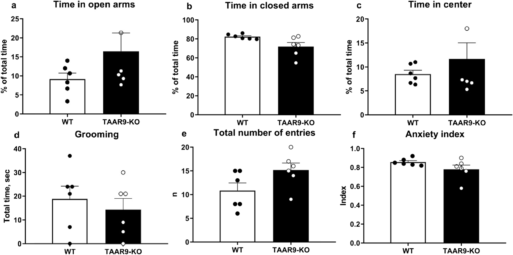 Elevated Plus Maze (EPM) evaluation of anxiety-like behaviors in TAAR9-KO vs. WT rats, depicting (a) % of time in open arms, (b) % of time in closed arms, (c) % of time in the center, (d) time spent grooming, (e) total number of entries and (f) the anxiety index. No significant differences arose as per the Mann-Whitney U test (p > 0.05). All graphs show means ± SEM (n = 6 per group).
