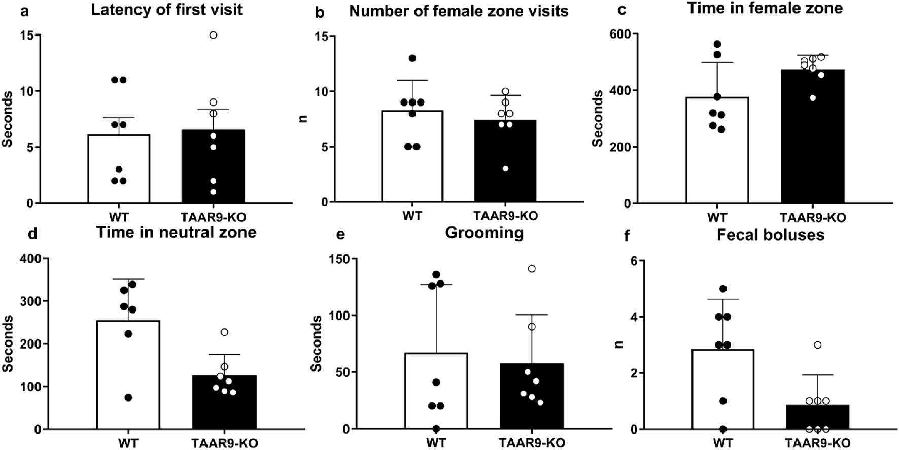 Sexual Incentive Motivation Test (SIMT) evaluation of sexual motivation in TAAR9-KO vs. WT rats. No significant changes (p > 0.05) were found in the (a) latency of first visit to female zone, (b) number of female zone visits, (c) time in female zone, (d) time in neutral zone, (e) total time of grooming, and (f) number of fecal boluses. Data are presented as mean ± SEM (n = 11 per group); all comparisons were made by the Mann-Whitney U test.