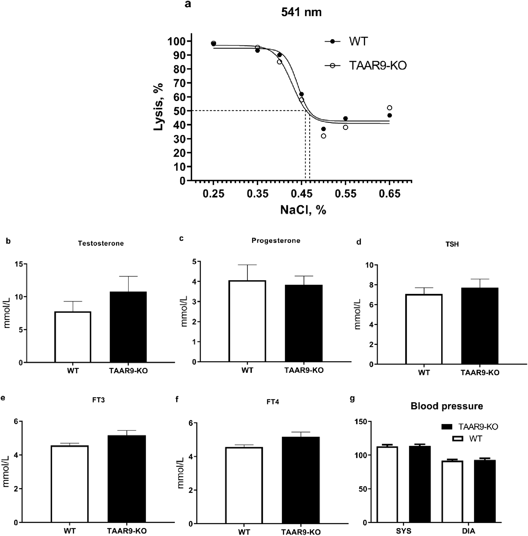 Comparison of hematological parameters from WT and TAAR9-KO rats. (a) shows a representative graph of averaged spectrophotometric measurements quantifying erythrocyte fragility by % lysis at increasing salt concentrations plotted as % (w/v) salt; the plotted 50% lysis points (dashed lines) were WT = 0.468 and KO = 0.459% salt. Graphs (b–f) depict an automatic blood analyzer’s estimates of millimoles hormone per liter serum. Graph (g) shows systolic (SYS) and diastolic (DIA) arterial pressure in mmHg measured in rat tails. Hormone abbreviations: TSH, thyroid stimulating hormone; FT3, free triiodothyronine; FT4, free thyroxine. All reported data are means (n = 9–10 per group) and error bars depict respective SEM values. All comparisons were not significant as per the unpaired t-test (p > 0.05).