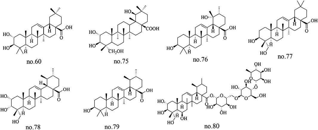 Terpenoids represent a major class of natural products in Staphylea arguta, with structural diversity primarily encompassing triterpenes and their derivatives. Among the identified terpenoids, several triterpenic metabolites have been isolated and characterized, including corosolic acid-28-O-β-D-glucopyranoside ester (no.56), 2α-peroxyhydroxy ursolic acid (no.60), pomolic acid (no.76), 23-hydroxyoleanolic acid (no.77), 2α,3α,23-trihydroxy ursolic acid (no.78), ursolic acid (no.79), and asiaticoside A (no.80) (Ma et al., 2013; Wu et al., 2012; Kuang et al., 2019). Additionally, 2α,3β,19β-23-tetrahydroxyolean-12-en-28-oic acid (no.75) were identified from Staphylea arguta (Huang et al., 2012). The structures of some metabolites are shown in Figure 3.