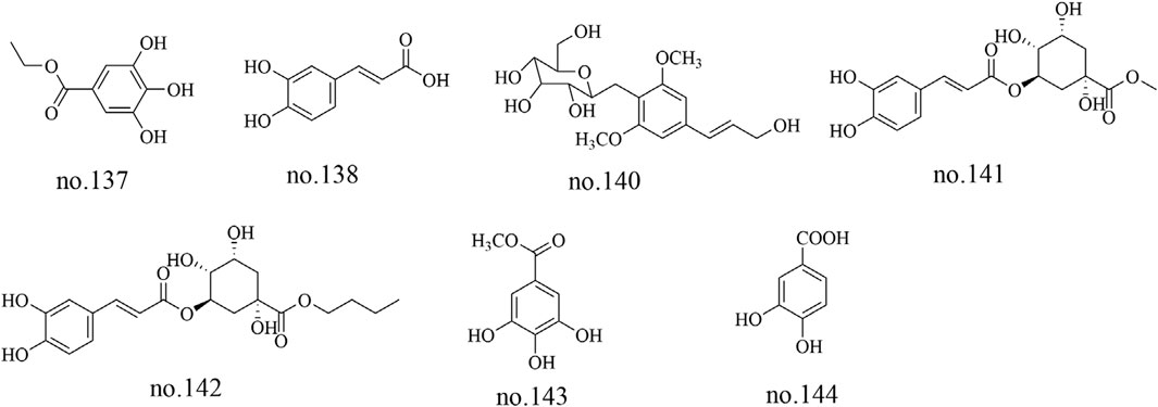 Based on their structural characteristics, phenolic metabolites can be categorized into phenols, phenylpropanoids, and others. Gallic acid ethyl ester (no.137), caffeic acid (no.138), syringin (no.140), chlorogenic acid methyl ester (no.141), chlorogenic acid butyl ester (no.142), methyl gallate (no.143) and 3,4-dihydroxybenzoic acid (no.144) were identified from Staphylea arguta (Wu, 2010; Li et al., 2013; Li et al., 2015). The structures of some metabolites are shown in Figure 4.