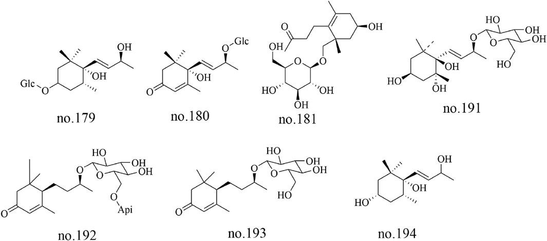 Megastigmanes constitute a class of organic metabolites characterized by distinctive cage-like frameworks. 3S,5R,6R,9S-stetrahydroxy megastigmane (no.179), corchoionoside C (no.180), icariside B4 (no.181), turpinionosides A to E (no.182–186), megastigman-7-ene-3,5,6,9-tetrol-9-O-β-D-glucopyranoside (no.191), byzantionoside B6′-O-β-D-apiofuranoside (no.192), byzantionoside B (no.193) and megastigmene-3,6,9-triol (no.194) were identified from Staphylea arguta (Yu et al., 2002; Wu et al., 2014). The structures of some metabolites are shown in Figure 5.