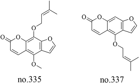 In addition to the aforementioned metabolites, Staphylea arguta also contains fatty acids, coumarins, lactones, vitamins, and other metabolites. Liu et al. utilized LC-MS to analyze the moderately polar metabolites in the volatile oil extracted from Staphylea arguta. They identified fatty acid metabolites, including isopalmitic acid (no.292), oleic acid (no.293) and myristic acid (no.294), as well as coumarin metabolites such as phellopterin (no.335) and isoimperatorin (no.337) (Liu et al., 2022). The structures of some metabolites are shown in Figures 9, 10.