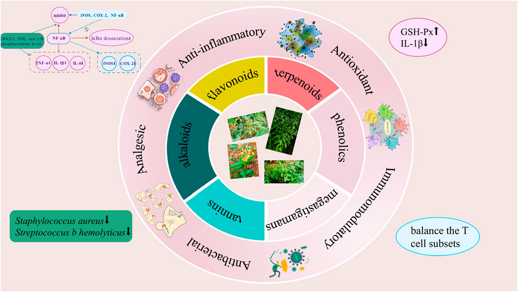 Modern pharmacological studies have demonstrated that Staphylea arguta exhibits a range of biological activities, including anti-inflammatory, antioxidant, immunomodulatory, antibacterial, and analgesic effects (Figure 11). Metabolites with pharmacological activities include flavonoids, volatile oils, among others (Table 1).