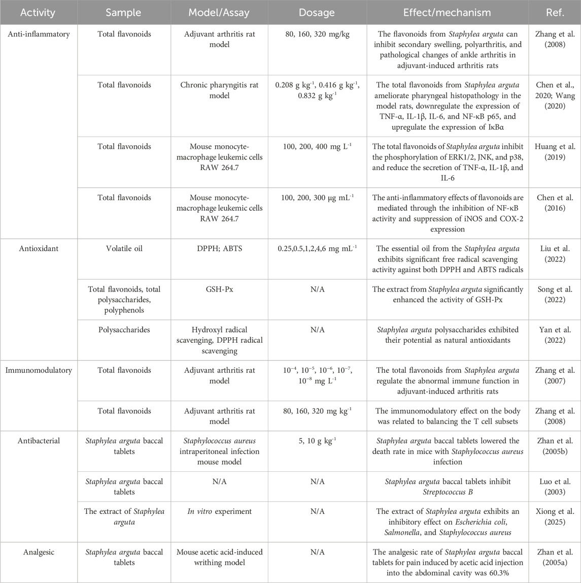 Citation: Cui H, Wei Z, Feng C, Tao X and Yi J (2025) Research progress on phytochemistry and pharmacology of Staphylea arguta (Lindl.) Byng & Christenh. and prediction of quality markers: a review. Front. Pharmacol. 16:1684371. doi: 10.3389/fphar.2025.1684371
