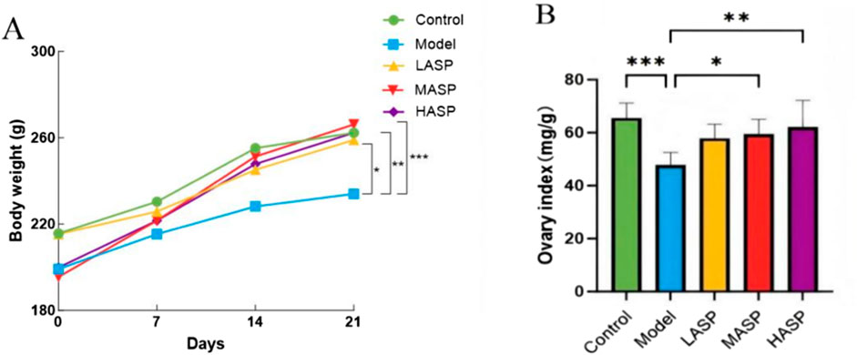 The changes in the bodyweights of the rats (measured once a week) are shown in Figure 1A. The bodyweights of the rats increased gradually with increase in treatment administration duration. However, the bodyweights of rats in the model group increased slowly compared to those in the control and ASP intervention groups. By day 21, the bodyweight differences of the control and ASP intervention groups were statistically significant compared to those of the model group (p < 0.001). The ovarian index results were observed to be significantly lower in the model group than the control group (p < 0.001). In addition, the ovarian index values were elevated in the ASP intervention groups compared to the model group, with no significant difference compared to the LASP group but statistically significant differences compared to the MASP and HASP groups (p < 0.05 and p < 0.01, respectively), as shown in Figure 1B.