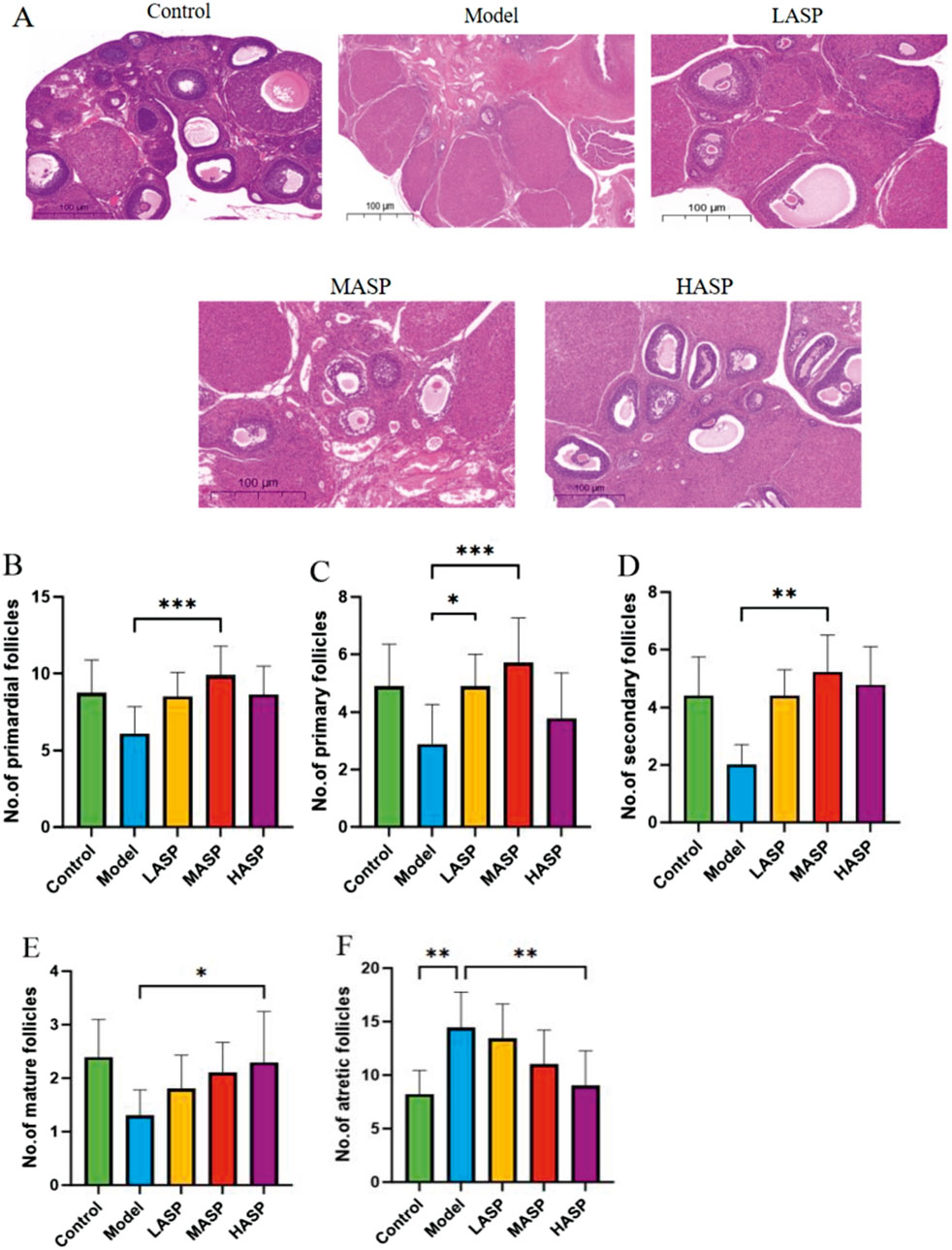 In the control group, the follicles were structured at all levels, and the granulosa cells were arranged neatly and closely. In the model group, there were fewer follicles in the ovaries, and the granulosa cells were arranged irregularly. In the ASP intervention groups, the numbers of follicles were significantly increased at all levels, and the granulosa cells were arranged more densely compared to the model group (Figure 2A). Upon follicle counting, the model group showed fewer follicle growth at all levels than the control group; although this decrease was not statistically significant, the atretic follicles showed a significant increase (p < 0.01), indicating an initial success with the POI rat model. Compared to the model group, the low-, medium-, and high-dose ASP groups showed increased follicle growths at all levels. Here, compared to the model group, the primordial, primary, and secondary follicles increased significantly (p < 0.01) in the MASP group; mature follicles increased (p < 0.05) and atretic follicles reduced (p < 0.01) significantly in the HASP group; and the increases in follicles at all levels were not statistically significant in the LASP group, as shown in Figures 2B–F.