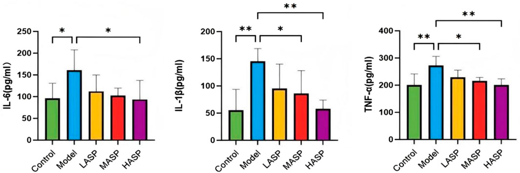 Compared to the control group, the serum levels of IL-6, IL-1β, and TNF-α were statistically significantly elevated in the model group. Compared to the model group, the individual proinflammatory cytokines were dose-dependently reduced in the different drug intervention groups, with no statistically significant differences noted in the ASP low-dose group; however, there were notable differences in the ASP medium-dose (IL-1β: p < 0.05, TNF-α: p < 0.05) and high-dose (IL-1β: p < 0.01, TNF-α: p < 0.01) groups. The IL-6 levels were statistically significant in the ASP high-dose group compared to the model group (p < 0.05), and the proinflammatory cytokine levels were not statistically significantly different among the different ASP dose groups, as shown in Figure 4.