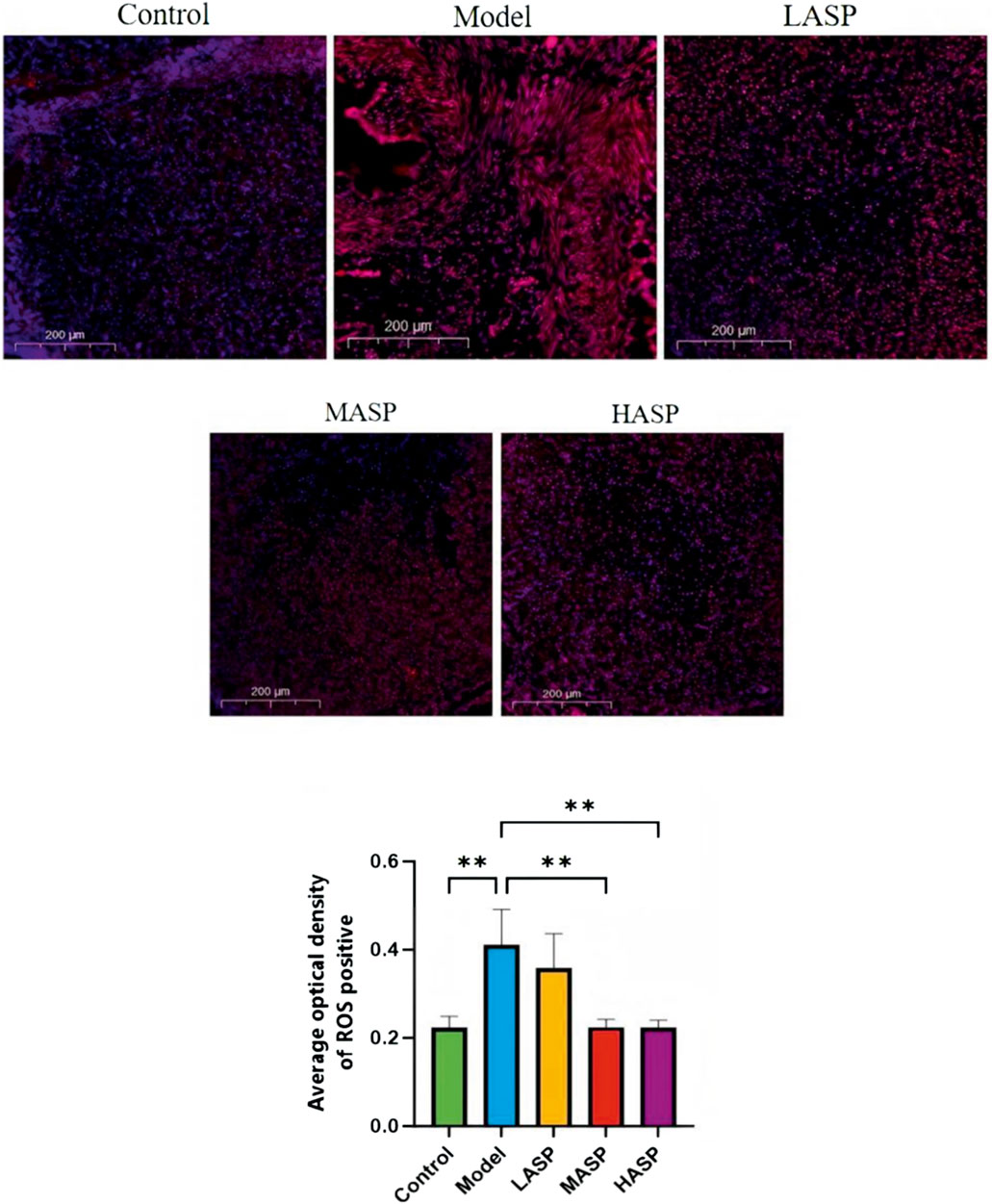 The ROS levels in the ovarian tissues were assessed using the DHE fluorescent probe (Figure 6). Compared to the control group, the model group exhibited extensive DHE-positive staining in the ovarian tissues, indicating significantly elevated ROS levels. However, the DHE-positive areas were markedly reduced across different dosage groups compared to the model group following ASP intervention and showed significant decreases in ROS levels (p < 0.01). Collectively, these results demonstrate that ASP intervention significantly alleviates oxidative stress in the ovarian tissues of POI rats, with notable effects observed in the medium- and high-dose groups.