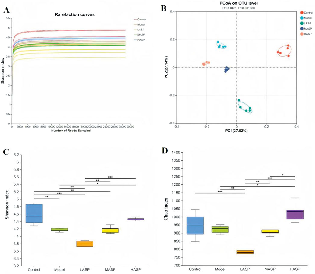 Figure 7. Differences in the overall structure of gut microbiota among the experimental groups. (A) Dilution graphs showing evaluation of the reasonability of the sequencing data. (B) Principal coordinate analysis (PCoA) plot showing clustering of beta diversity among the groups. (C) Shannon and (D) Chao indexes showing the alpha diversity among the groups. *p < 0.05, **p < 0.01, ***p < 0.001.
