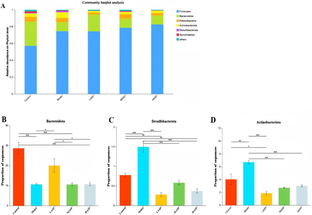 Figure 8. Relative abundances of different bacterial species at the phylum level. (A) Distribution of rat intestinal flora at the phylum level. Relative abundances of the phyla (B) Bacteroidota; (C) Desulfobacterota; (D) Actinobacteriota in different experimental groups. *p < 0.05, **p < 0.01, and ***p < 0.001.