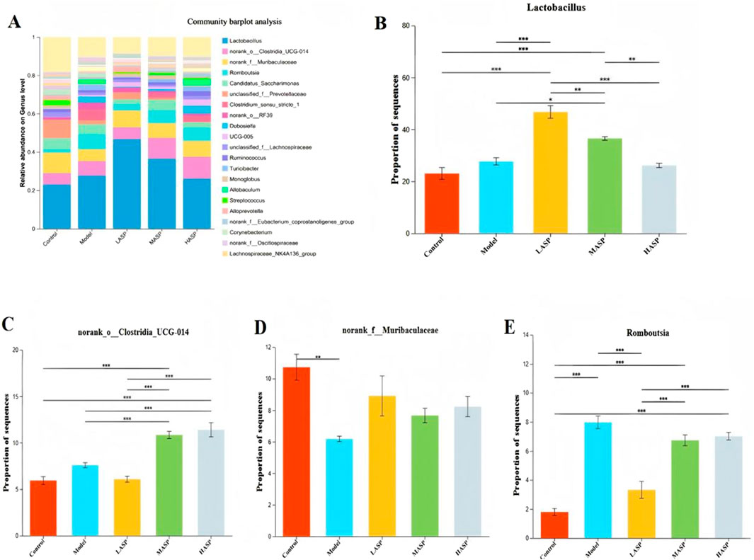 Differences among the gut microbiota of the experimental groups were also analyzed at the genus level of classification. The results showed that Lactobacillus (Lactobacillus), norank_o_Clostridia_UCG-014, norank_f_Muribaculaceae, and Romboutsia were the dominant genera in all groups (Figure 9). Compared to the control group, the relative abundances of norank_f_Muribaculaceae, Candidatus_Saccharimonas, unclassified_f_Prevotellaceae, unclassified_f_Lachnospiraceae, Ruminococcus (Ruminococcus), Monoglobus, and Streptococcus decreased in the model group. The ASP intervention groups showed increased relative abundances of Lactobacillus spp, norank_o_Clostridia_UCG-014, and norank_f_Muribaculaceae. Thus, we demonstrated that ASP could also improve the intestinal flora at the genus level.