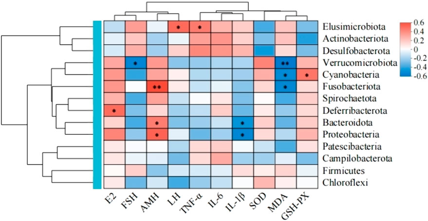 Spearman’s correlation analysis was performed between the various species and their relevant indicators based on the key species differences between the groups (Figure 10). The results show that at the phylum level, Verrucomicrobiota, Fusobacteriota, Deferribacterota, Bacteroidota, and Proteobacteria were positively correlated with serum E2 and AMH levels as well as negatively correlated with FSH and LH levels. The Campylobacterota showed a positive correlation with serum E2 level as well as negative correlations with AMH, FSH, and LH levels; Actinobacteria, Desulfobacteria, and Firmicutes were positively correlated with serum FSH level and negatively correlated with E2 and AMH levels. In terms of oxidative stress homeostasis, the ovarian tissue MDA level was positively correlated with the abundances of phyla Actinobacteria, Desulfovibrio, and thick-walled Bacillus while being negatively correlated with the abundances of phyla Micrococcus wartyi, Clostridium, Desulfovibrio, Anaplastomycetes, Ascomycetes, and Campylobacter. The antioxidant enzyme correlation analysis showed contrasting results, with the SOD and GSH-Px activities positively correlated with the abundances of phyla Micrococcus wartyi, Clostridium, Desmodium, Anaplasma, and Ascomycetes but negatively correlated with the abundances of phyla Actinobacteria, Desmodium, and Campylobacter. In the correlation analysis with proinflammatory cytokines, the serum IL-6, IL-1β, and TNF-α levels were positively correlated with the abundances of phyla Actinobacteria and Desulfovibrio but negatively correlated with the abundances of phyla Micrococcus wartimei, Clostridium sp., Mycobacterium anomalum, and Aspergillus. In addition, the serum IL-6 level was positively correlated with the abundances of phyla Desulfovibrio and Campylobacter but negatively correlated with the abundances of thick-walled phylum. The serum TNF-α level was positively correlated with the abundance of phylum Campylobacter but negatively correlated with the abundances of Desmodium and thick-walled phyla. These findings indicate that there are close correlations and interactions among the above intestinal flora and serum sex hormone, proinflammatory cytokine, and oxidative stress levels in ovarian tissues.