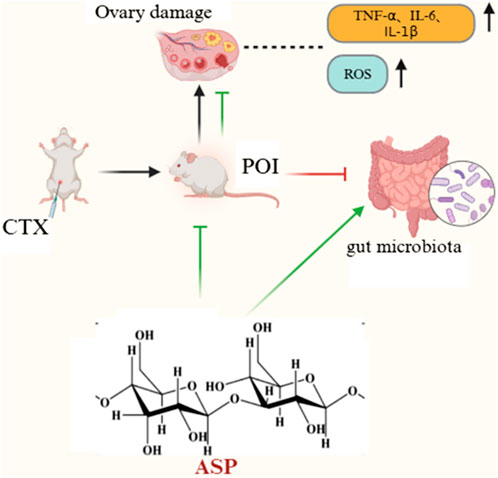 Results: ASP treatment improved sex hormone secretion in the chemotherapy-induced POI rats, in addition to increased E2 and AMH levels, decreased FSH and LH levels, improved ovarian tissue structure, and increased follicle growth at all stages. ASP treatment also improved the serum inflammatory levels in POI rats by reducing the IL-6, IL-1β, and TNF-α levels; it decreased oxidative stress levels in the ovarian tissue, inhibited ROS and MDA activities, and increased SOD and GSH-Px activities. The gut microbiota differential analysis showed that chemotherapy-induced POI rats exhibited dysbiosis of the gut microbiota. After ASP treatment, the α and β diversities of the gut microbiota changed, thereby increasing the relative abundance of beneficial bacteria and decreasing the relative abundance of harmful bacteria. Spearman’s correlation analysis was performed between the main differential microbiota as well as serum sex hormone, proinflammatory cytokine, and ovarian tissue oxidative stress levels; accordingly, the results showed that some beneficial bacteria were positively correlated with E2, AMH, SOD, and GSH-Px levels while being negatively correlated with FSH, LH, MDA, IL-6, IL-1β, and TNF-α levels.