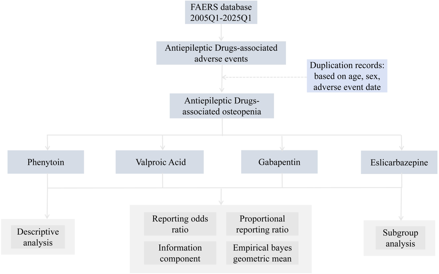 Given the widespread clinical use of antiepileptic drugs and the long-term nature of their treatment regimens, drug-related adverse events associated with these medications are increasingly drawing attention (Perlman et al., 2019). Specifically, existing studies have reported that such drugs may increase the risk of adverse events related to osteopenia (Pack and Morrell, 2001). Among these, as a first-line drug for treating epilepsy, the association between phenytoin and osteopenia has been widely reported and has become a mainstream consensus (Kanner and Bicchi, 2022). However, the link between valproic acid, another first-line drug for treating epilepsy, and osteopenia remains controversial (Min et al., 2020; Tao et al., 2021; Wang et al., 2025). Additionally, the association between other antiepileptic drugs and osteopenia adverse events has not been systematically reported. Despite these research gaps, potential associations may exist between these antiepileptic drugs and osteopenia-related adverse events. As a quarterly updated database maintained by the United States (U.S.) Food and Drug Administration (FDA), the Adverse Event Reporting System (FAERS) is one of the largest publicly available databases on drug adverse reactions, providing researchers with raw data from the FDA’s official website. FAERS is managed by the FDA and integrates adverse event (AE) reports submitted by healthcare professionals, patients, pharmaceutical companies, and other stakeholders, serving as a data source for retrospective observational pharmacovigilance studies. It can detect trends in unexpected adverse events that may not have been identified due to limitations in clinical trial participants. Therefore, this study, based on the FAERS database, aims to investigate the potential association between commonly used antiepileptic drugs and osteopenia, with the goal of providing valuable reference information for rational drug use in clinical practice.