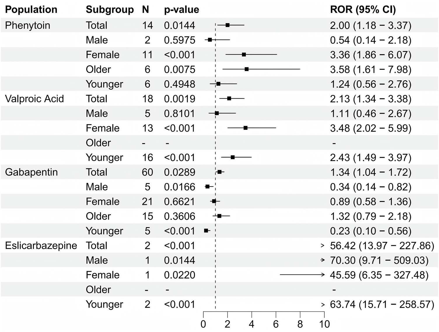 Subgroup analysis of antiepileptic drugs based on age and gender.