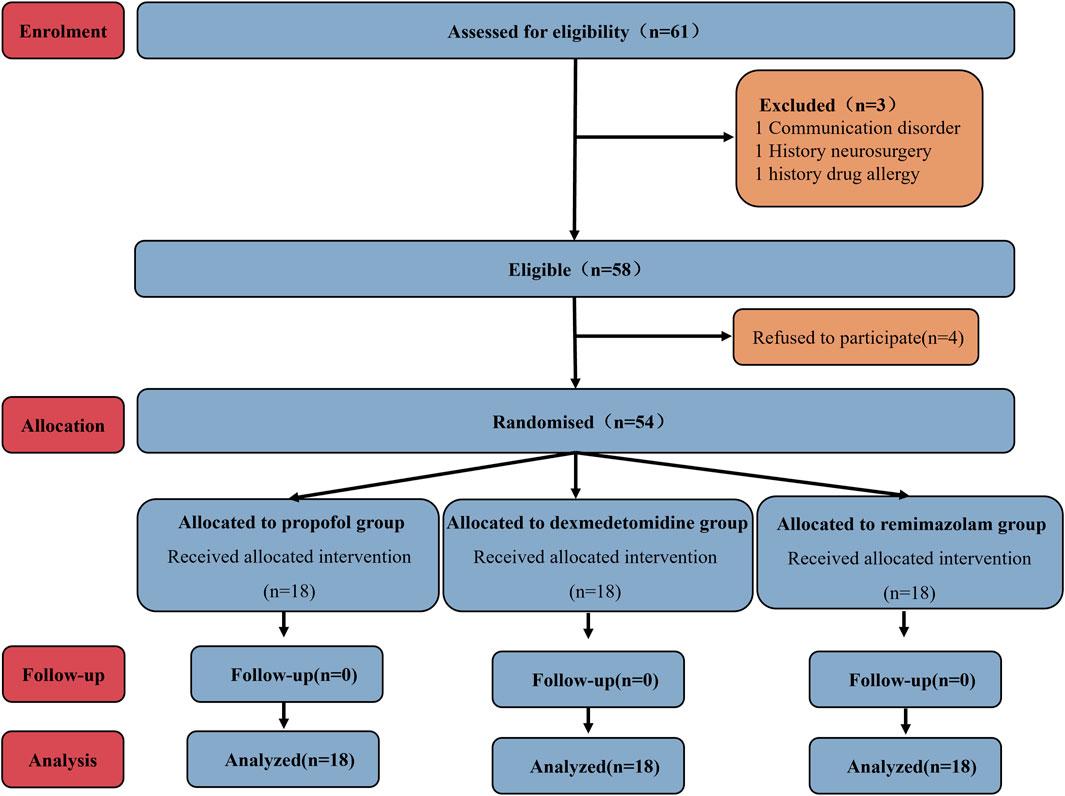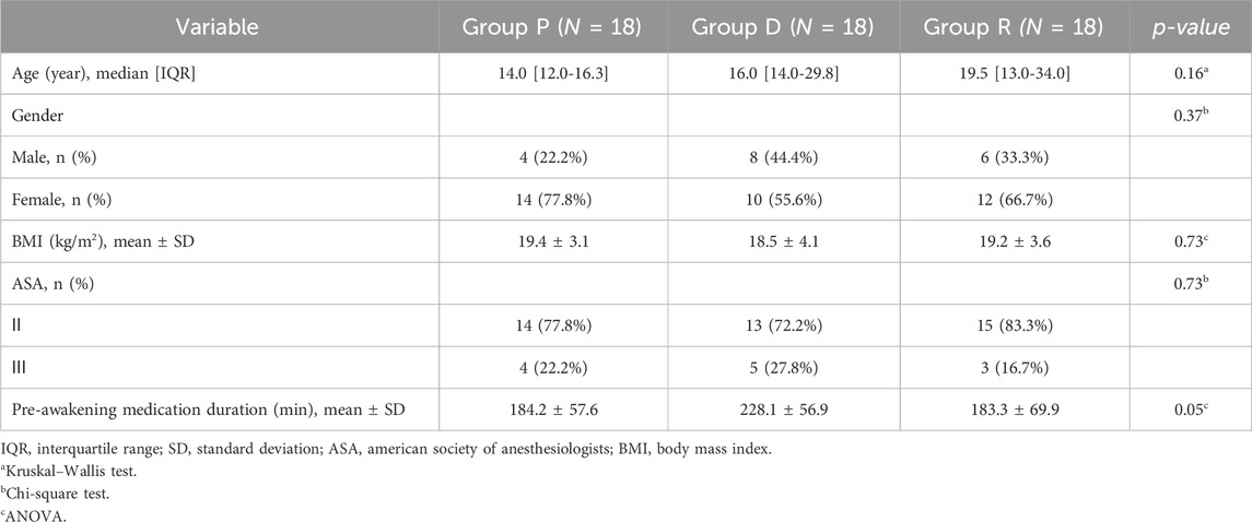 A total of 61 patients were initially recruited; 4 patients declined participation. The remaining 57 patients were randomly assigned to Groups P, D, and R. Subsequently, exclusions occurred as follows: one patient from Group P due to communication barriers, one patient from Group D due to a documented history of drug allergy, and one patient from Group R due to prior cranial surgery. Ultimately, each group comprised 18 participants for analysis (Figure 1). As shown in Table 1, no statistically significant differences existed among the three groups regarding baseline demographic and clinical characteristics (age, gender, BMI, ASA classification, anesthesia induction time, and pre-awakening medication maintenance duration).