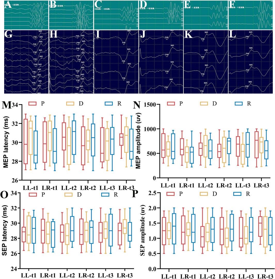 Figure 2. Lower Limb SEP and MEP Latency and Amplitude. (A) Right lower limb MEP waveform (Group P); (B) Left lower limb MEP waveform (Group P); (C) Right lower limb MEP waveform (Group D); (D) Left lower limb MEP waveform (Group D); (E) Right lower limb MEP waveform (Group R); (F) Left lower limb MEP waveform (Group R); (G) Right lower limb SEP waveform (Group P); (H) Left lower limb SEP waveform (Group P); (I) Right lower limb SEP waveform (Group D); (J) Left lower limb SEP waveform (Group D); (K) Right lower limb SEP waveform (Group R); (L) Left lower limb SEP waveform (Group R); (M) Latency statistics for lower limb MEP at timepoints t1, t2, t3 [M (P25-P75)]; (N) Amplitude statistics for lower limb MEP at timepoints t1, t2, t3 [M (P25-P75)]; (O) Latency statistics for lower limb SEP at timepoints t1, t2, t3 [M (P25-P75)]; (P) Amplitude statistics for lower limb SEP at timepoints t1, t2, t3 [M (P25-P75)]. All data sets were analyzed using the Kruskal–Wallis test. LL, left lower limb; LR, right lower limb; t1, after exposure of the spinal surgical area; t2, after pedicle screw insertion; t3, after spinal alignment.