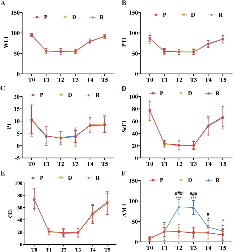 Figure 3. Perioperative Brain State Indexes. (A) WLi at various perioperative time points; (B) PTi at various perioperative timepoints; (C) Pi at various perioperative time points; (D) SCEi at various perioperative time points; (E) CEi at various perioperative time points; (F) AMi at various perioperative timepoints. All data are expressed as mean ± standard deviation (SD), analyzed by ANOVA, followed by Bonferroni’s post hoc multiple comparisons test. Compared to Group P, * represents p < 0.05, *** represents p < 0.001; compared to Group P, # represents p < 0.05, ### represents p < 0.001. Upon entering the operating room (T0), after anesthesia induction (T1), after exposing the spinal surgical area (T2), 20 min before intraoperative awakening (T3), immediately upon awakening (T4), and 10 min after surgery conclusion (T5).