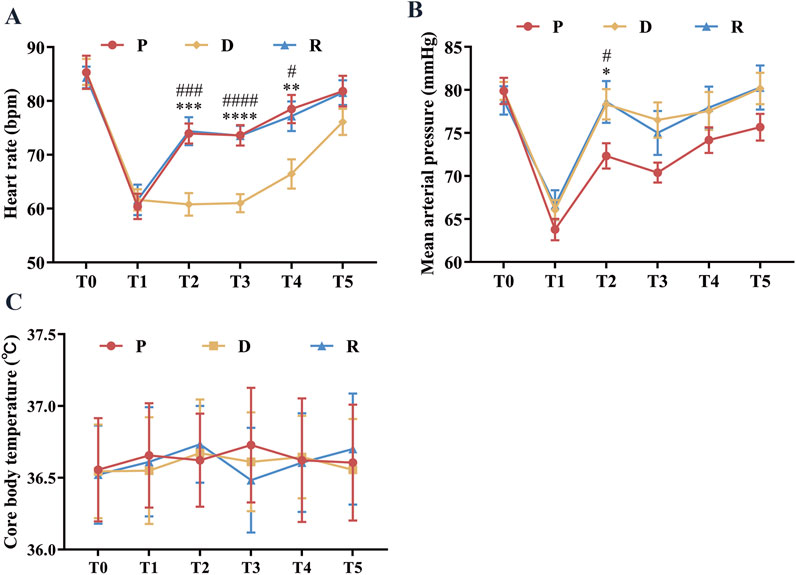 Figure 4. Perioperative Hemodynamics and Core Temperature. (A) Represents the heart rate at different perioperative time points. (B) Represents the mean arterial pressure at different perioperative time points. (C) Represents the mean Core body Temperature at different perioperative time points. All data are expressed as mean ± standard deviation (SD), analyzed by ANOVA, followed by Bonferroni’s multiple comparisons test for post hoc analysis. Compared to group P, * represents p < 0.05, ** represents p < 0.01; *** represents p < 0.001, **** represents p < 0.0001, compared to group D, ### represents p < 0.001; #### represents p < 0.0001. Upon entering the operating room (T0), after anesthesia induction (T1), after exposing the spinal surgical area (T2), 20 min before intraoperative awakening (T3), immediately upon awakening (T4), and 10 min after surgery conclusion (T5).
