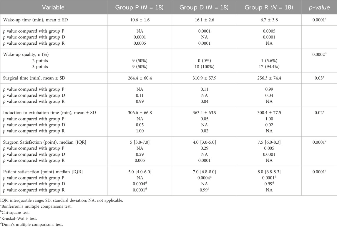 Regarding primary outcomes (Table 2), the wake-up times differed significantly among groups: Group P had a mean of 10.58 ± 1.60 min (95% CI, 9.78–11.38), Group D 16.14 ± 2.64 min (95% CI, 14.83–17.45), and Group R 6.69 ± 3.85 min (95% CI, 4.77–8.61). Post-hoc analysis indicated that Group R had significantly shorter wake-up times compared to Group P (mean difference 3.9 min, 95% CI: 1.6–6.2, Bonferroni-corrected p = 0.0005) and Group D (mean difference 9.4 min, 95% CI: 7.1–11.8, Bonferroni-corrected p = 0.0001). Additionally, excellent wake-up quality was observed in 9 (50%) patients in Group P, 18 (100%) in Group D, and 17 (94.4%) in Group R (p = 0.0002). The mean operative durations also differed significantly among groups: Group P, 264.4 ± 60.4 min (95% CI, 234.4–294.5); Group D, 310.9 ± 57.9 min (95% CI, 282.1–339.7); and Group R, 256.3 ± 74.4 min (95% CI, 219.3–293.3) (p = 0.03). Post-hoc analysis revealed that Group R had significantly shorter operative durations compared to Group D (p = 0.04), while other pairwise comparisons were not statistically significant (p > 0.05).