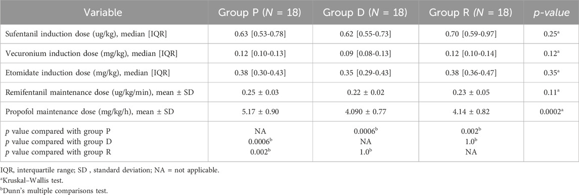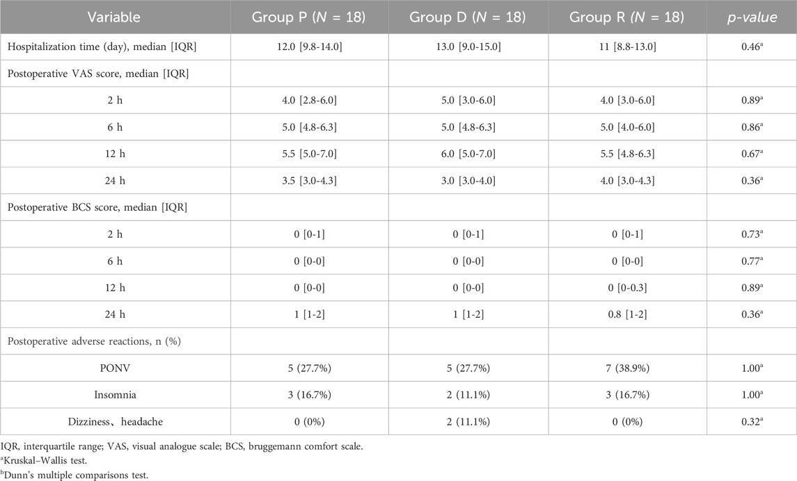 Analysis of additional outcome measures indicated no statistically significant differences among Groups P, D, and R regarding the consumption of anesthetic drugs (sufentanil, etomidate, vecuronium, and remifentanil; p > 0.05, Table 3). Moreover, postoperative pain assessment (VAS scores) and comfort evaluation (BCS scores) at 2, 6, 12, and 24 h postoperatively showed no significant differences among the three groups (p > 0.05, Table 4). Additionally, the incidence of adverse events within 24 h postoperatively did not differ significantly among Groups P, D, and R (p > 0.05).