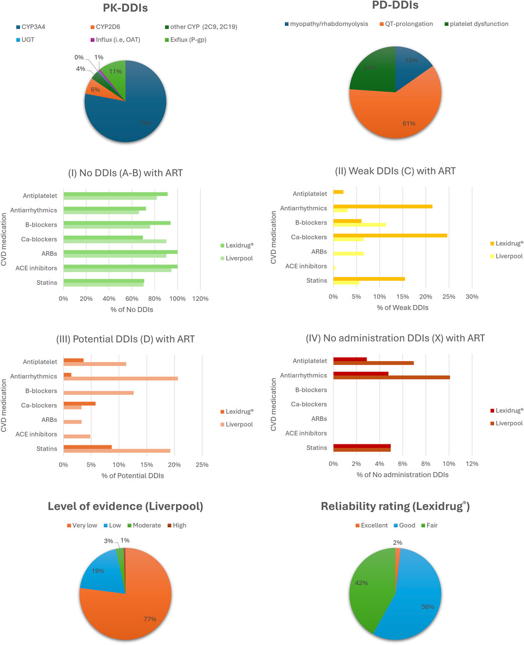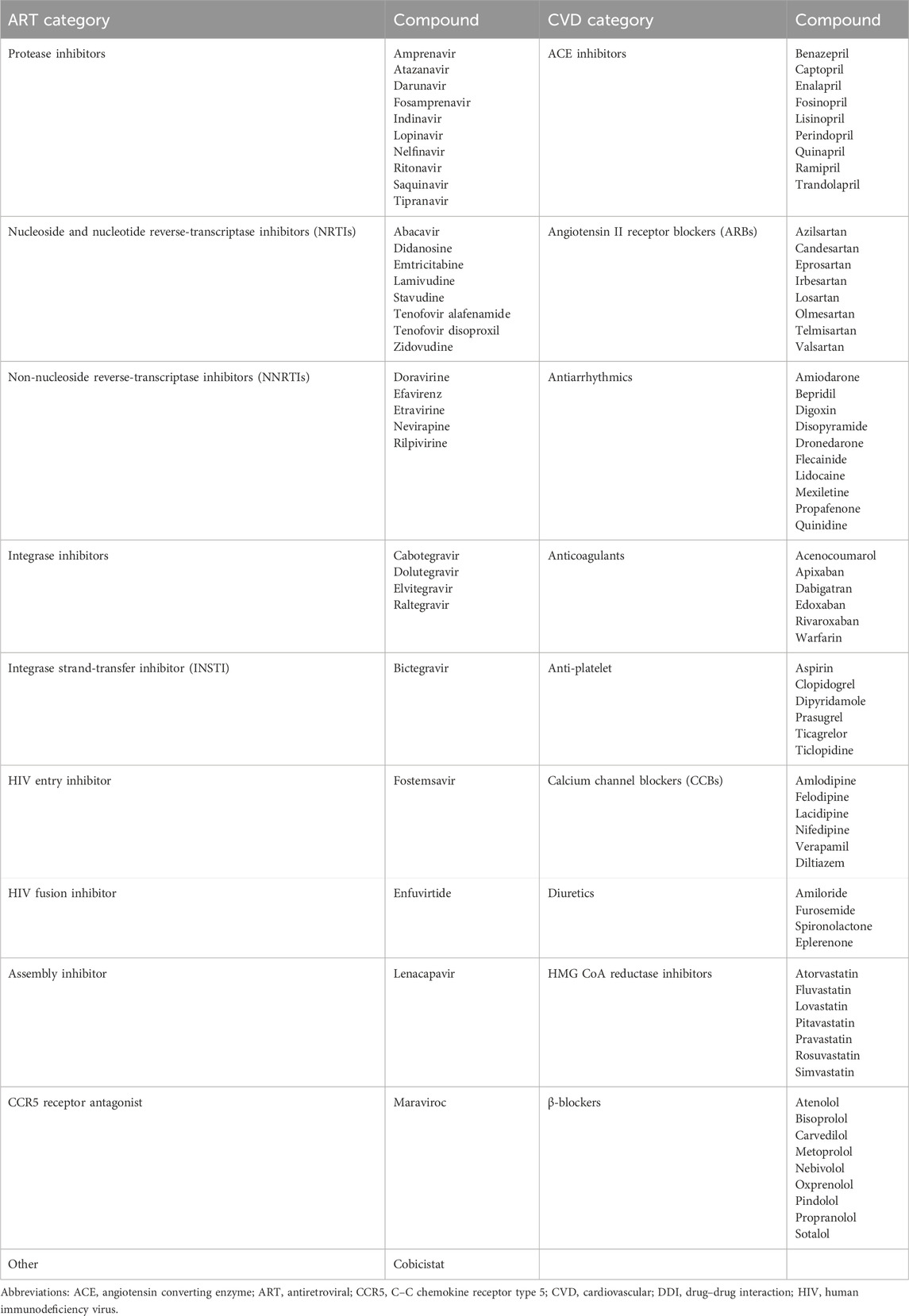 This review examines the current literature on potential DDIs between ART drugs and cardiovascular medications. It also incorporates data from drug interaction tools often used in clinical practice to identify and manage these interactions (Abarca et al., 2006; Roblek et al., 2015). Drug interaction checkers, such as the evidence-based “HIV Drug Interaction Checker” (University of Liverpool) and the subscription-based Lexidrug® database, are key resources that provide real-time information on the interaction potential and clinical significance (University of Liverpool, 2024; Uptodate Lexi-drug, 2024). In this review, both tools were used to identify potential DDIs between ART and CVD medications comprehensively. This dual approach aimed to enhance sensitivity, validate identified DDIs, and ensure comprehensive data coverage. Moreover, it allows us to identify any potential discrepancies that we aim to resolve, facilitating an advanced analysis of the interplay between ART drugs and potentially interacting CVD drugs. By integrating these tools with a detailed literature review, this study identifies, evaluates, and synthesizes relevant data. It also addresses potential discrepancies to inform clinical practice and guide the co-administration of ART and CVD medications.