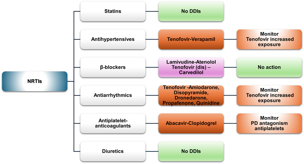 Figure 2. An overview of the potential DDIs between NRTIs and CVD medications with the most prominent cases and the suggested action according to the checkers used and literature data (green, no DDIs; light purple, potential but of low significance; red, clinically significant).