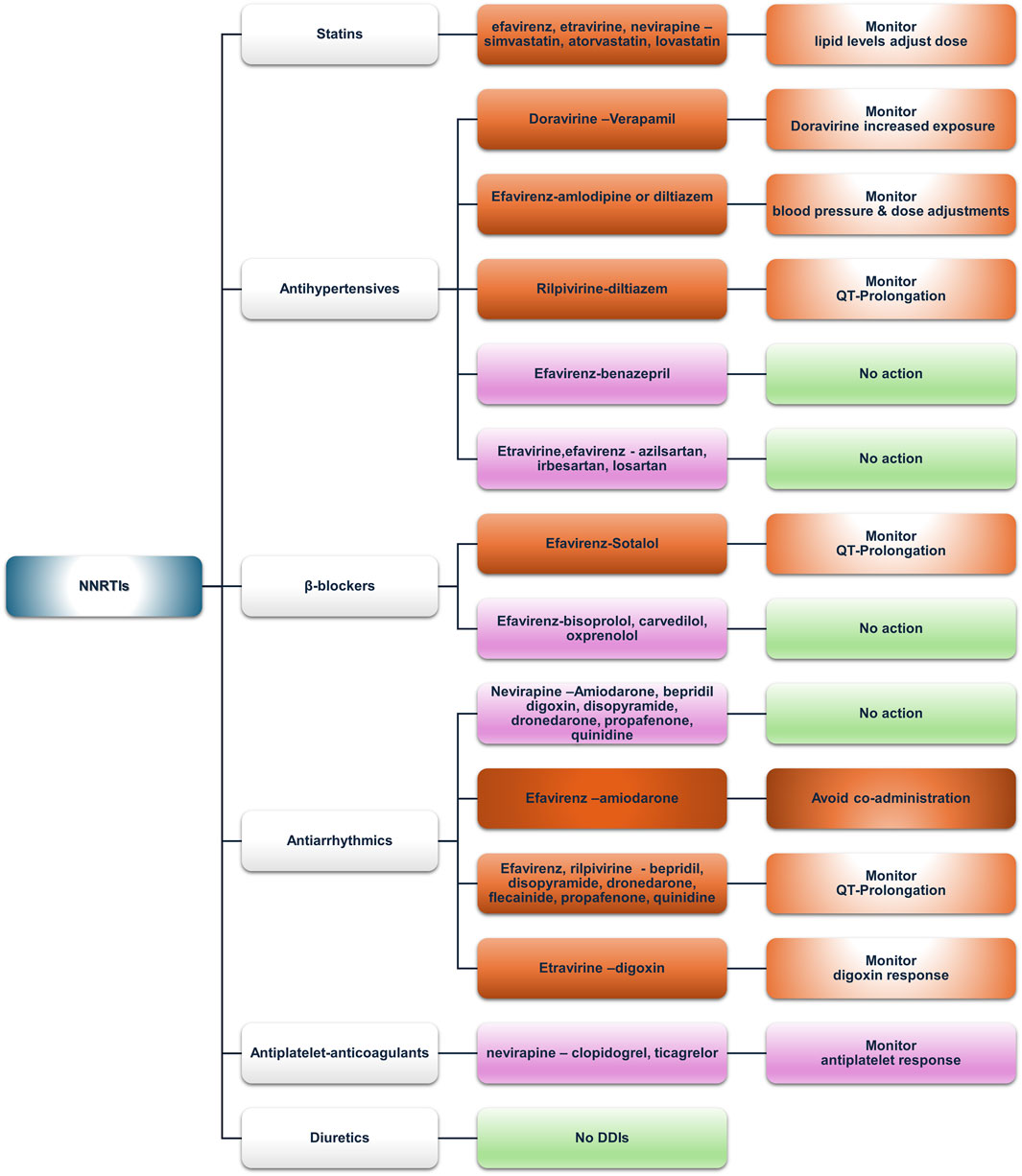 Figure 3. An overview of the potential DDIs between NNRTIs and CVD medications with the most prominent cases and the suggested action according to the checkers used and literature data (green, no DDIs; light purple, potential but of low significance; red, clinically significant; dark red, avoid).