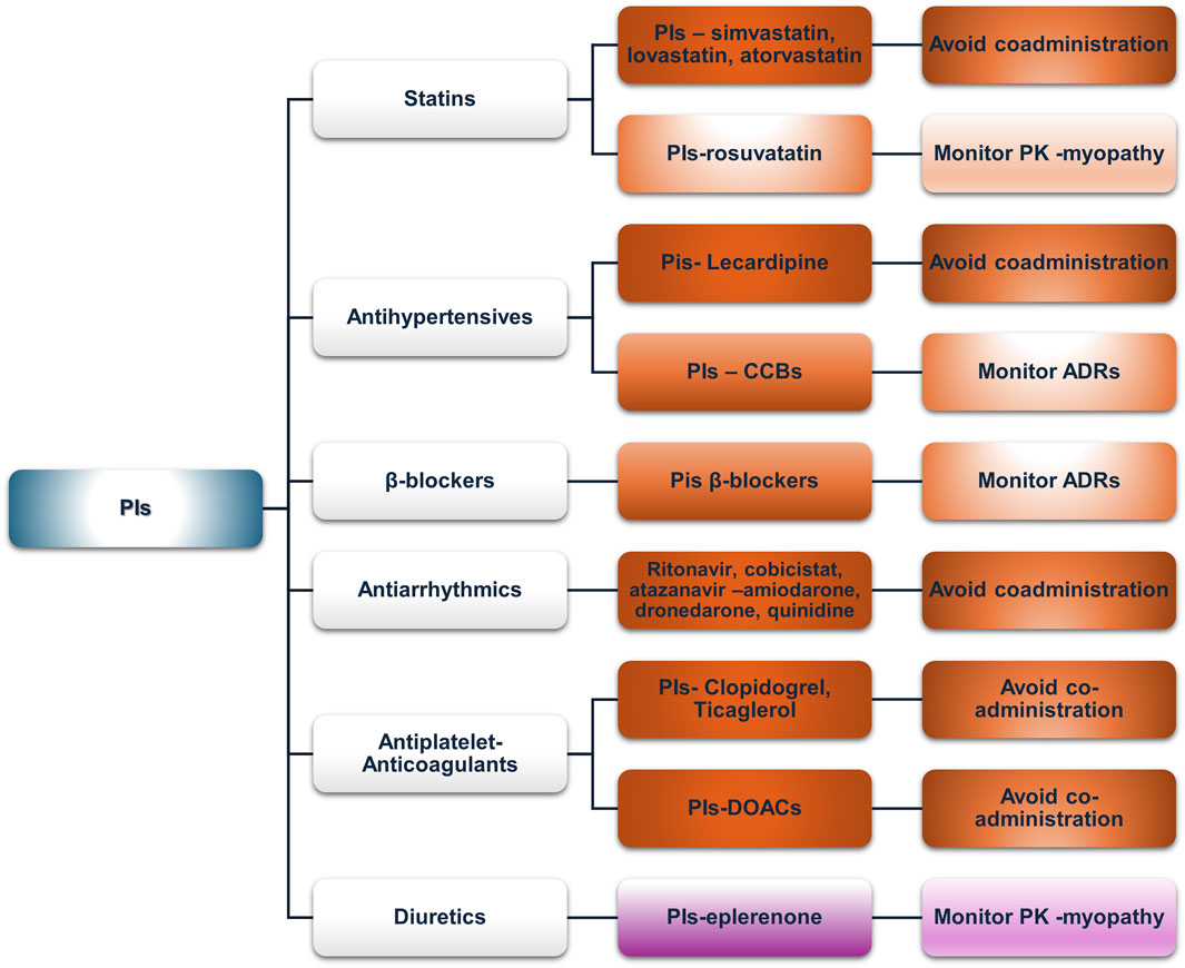 Figure 5. An overview of the potential DDIs between PIs and CVD medications with the most prominent cases and the suggested action according to the checkers used and literature data (green, no DDIs; light purple, potential but of low significance; red, clinically significant; dark red, avoid).