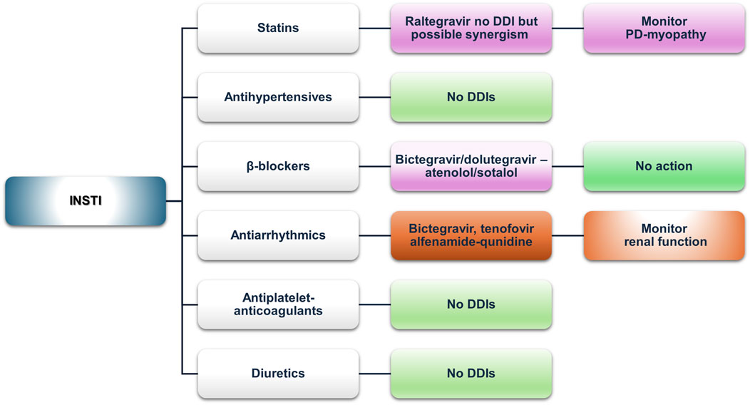 Figure 4. An overview of the potential DDIs between INSTIs and CVD medications with the most prominent cases and the suggested action according to the checkers used and literature data (green, no DDIs; light purple, potential but of low significance; red, clinically significant; dark red, avoid).