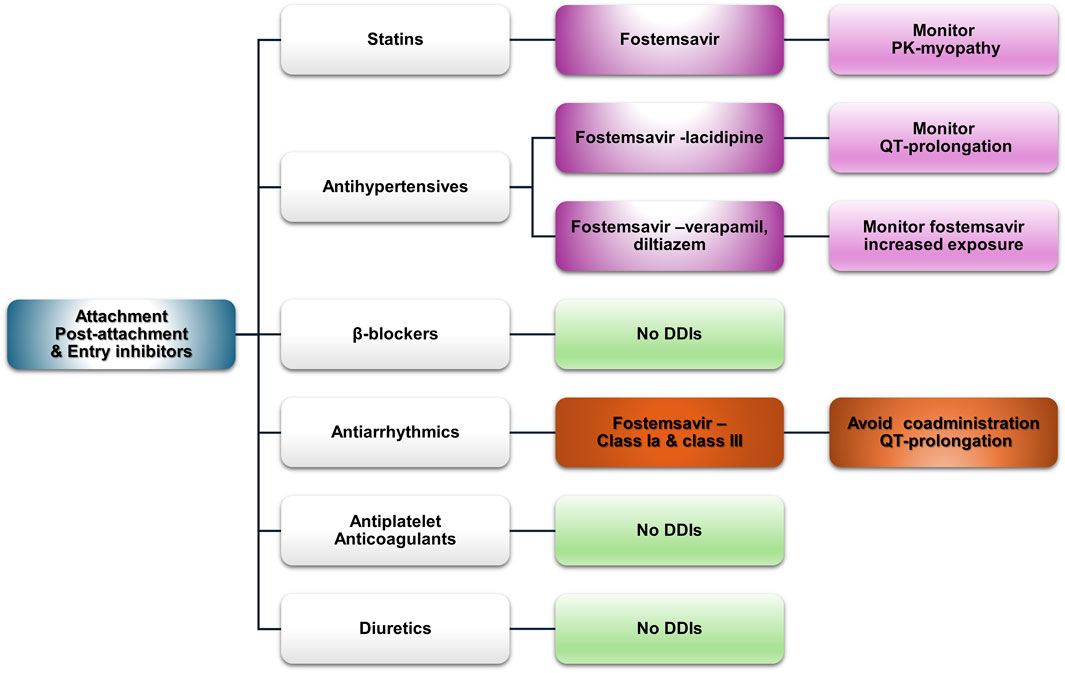 Figure 6. An overview of the potential DDIs between attachment-post attachment inhibitors and entry inhibitors and CVD medications with the most prominent cases and the suggested action according to the checkers used and literature data (green, no DDIs; light purple, potential but of low significance; red, clinically significant; dark red, avoid).