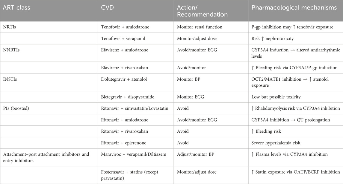 The growing need for CVD treatment in PLWH raises concerns about polypharmacy. It also highlights the potential for drug–drug interactions (DDIs) between ART and other medications, which may lead to adverse drug reactions (ADRs) (Edwards and Aronson, 2000; Marin et al., 2023; Peng et al., 2024). DDIs refer to alterations in drug exposure or response due to the co-administration of another drug (McQuade and Campbell, 2021). The clinical relevance of DDIs refers to the risk for ADRs or alterations in therapeutic efficacy (Scheife et al., 2015). DDIs occur through pharmacokinetic (PK-DDIs) mechanisms such as changes in absorption, distribution, metabolism, and elimination (ADME) processes or through pharmacodynamic (PD-DDIs) mechanisms involving additive, synergistic, or antagonistic effects of interacting drugs (Hines et al., 2012; Niu et al., 2019). Key PK-DDI mechanisms involve transporters such as P-glycoprotein (P-gp) and organic anion-transporting polypeptides (OATPs) and enzymes such as cytochrome P450 (CYP) and UDP-glucuronosyltransferases (UGTs) (Palleria et al., 2013; Yu et al., 2019). P-gp is a membrane transporter found in the intestine, liver, and other tissues. It plays a crucial role in drug absorption and elimination. Changes in P-gp activity can affect absorption and overall drug bioavailability. In HIV infection, transporters such as P-gp play a more dynamic role. Studies show altered protein density and gene expression in the gastrointestinal tract during treatment. ART-treated patients often exhibit increased P-gp expression, which may affect the DDI dynamics (De Rosa et al., 2013; Kis et al., 2016). Regarding drug metabolism, CYP enzymes, especially CYP1A2, CYP2C9, CYP2C19, CYP2D6, and CYP3A4/5, are responsible for nearly 80% of phase-I metabolism and over 50% of drug elimination (excluding biologics), with CYP3A4/5 alone metabolizing 40%–50% of all medications (Teo et al., 2015; Zanger and Schwab, 2013).
