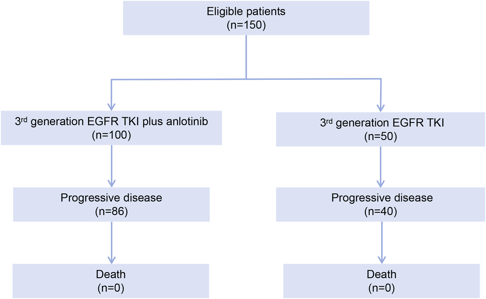 Based on literature, the median PFS was 3.1(Park et al., 2016), 5.4 (Soria et al., 2015) and 5.4 months (Soria et al., 2015), respectively, for patients who were treated with single agent erlotinib, an EGFR TKI plus platinum-containing doublet regimen, or standard platinum-containing doublet regimen after emergence of resistance to EGFR TKIs. In the ALTER-L001 trial, the median PFS was 9.2 months for patients with gradual, local or oligo-progression who were treated with anlotinib with continued EGFR TKI therapy (Chen et al., 2025). Based on previous studies and the ALTER-L001 trial (Soria et al., 2015; Park et al., 2016; Chen et al., 2025), a target sample size of 150 was anticipated that would provide 82% power with a one-sided α of 0.05, corresponding to a median PFS of 9.2 months and 5.4 months for the EGFR TKI plus anlotinib group (100 patients) and the EGFR TKI group (50 patients), respectively.