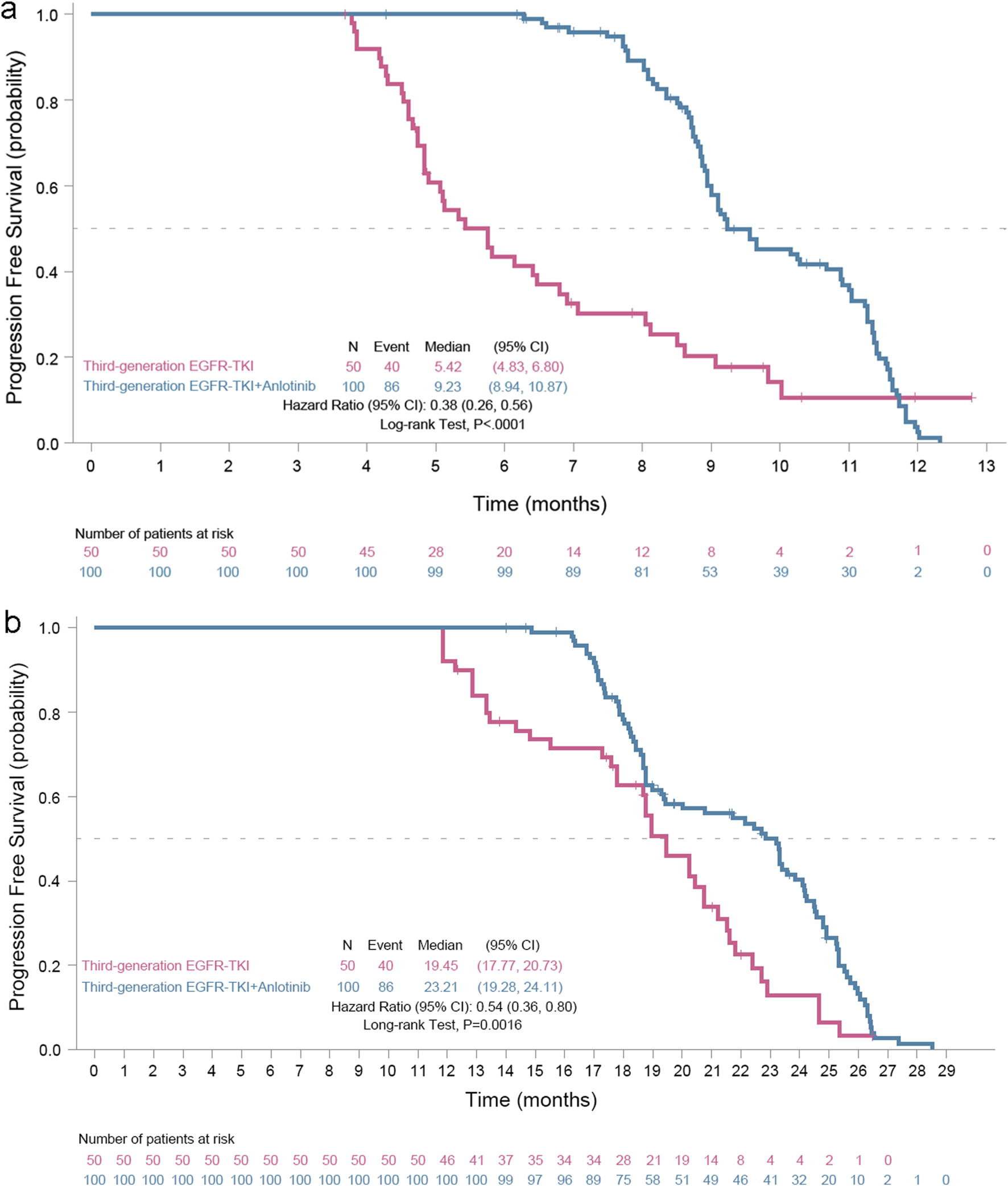 Between January 2020 and December 2023, 100 patients received EGFR TKI plus anlotinib and 50 received EGFR TKI. At the data cutoff (20 November 2024), the median progression-free survival was 9.23 months (95% CI, 8.94–10.87) with EGFR TKI plus anlotinib versus 5.42 months (95% CI, 4.83–6.80) with EGFR TKI (hazard ratio [HR] = 0.38, 95% CI, 0.26–0.56; log rank test, P < 0.0001), meeting the primary endpoint. Anlotinib was generally well tolerated, with manageable adverse events.
