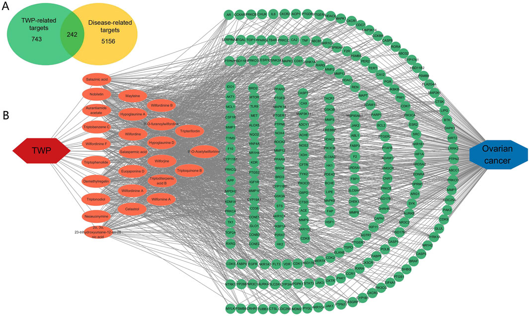 Figure 2. Network analysis of TWP and ovarian cancer targets. (A) Venn diagram illustrating overlap between TWP-predicted targets (n = 743) and ovarian cancer-related genes (n = 5,156), highlighting 242 shared targets. (B) Compound-target network: Yellow nodes represent TWP compounds; blue nodes represent targets; edges indicate interactions.