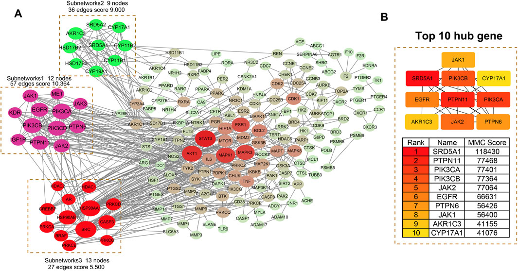 Figure 3. PPI network analysis of TWP targets. (A) Global PPI network with MCODE-identified subnetworks: Subnetwork 1: Signaling pathways (score = 10.364). Subnetwork 2: Steroid hormone biosynthesis (score = 9.000). Subnetwork 3: Inflammation/apoptosis (score = 5.500). Node size reflects connectivity; edges indicate interactions. (B) Top 10 hub genes ranked by degree centrality (interconnected subnetwork).