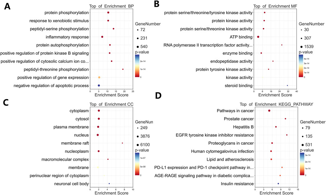 GO and KEGG analyses of the 242 targets identified 693 biological processes (BP), 95 cellular components (CC), 187 molecular functions (MF), and 167 KEGG pathways significantly enriched (p < 0.01). Top enriched terms (Figure 4) included: BP: Protein phosphorylation, response to xenobiotic stimuli, peptidyl-serine phosphorylation, inflammatory response (Figure 4A). MF: Protein kinase activity, ATP binding, enzyme binding, protein serine/threonine/tyrosine kinase activity (Figure 4B). CC: Cytoplasm, cytosol, plasma membrane, extracellular exosome (Figure 4C). KEGG: Cancer pathways (Pathways in cancer, Prostate cancer), signaling cascades (EGFR tyrosine kinase inhibitor resistance), and immune regulation (PD-L1/PD-1 checkpoint pathway) (Figure 4D). These results suggest TWP modulates proliferation, apoptosis, inflammation, and immune responses via multi-pathway regulation.