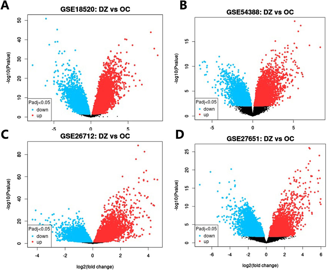 Figure 5. Volcano plots of DEGs in ovarian cancer datasets. (A) GSE18520, (B) GSE54388, (C) GSE26712, (D) GSE27651. Red dots: Upregulated genes (log2FC ≥ 1, adj. p < 0.05); Blue dots: Downregulated genes (log2FC ≤ −1, adj. p < 0.05); Gray dots: Non-significant genes.
