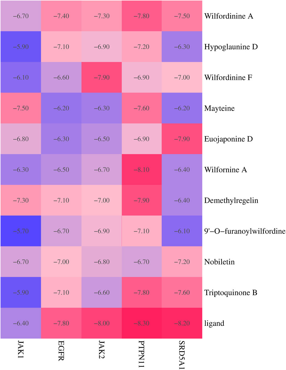 Figure 6. Heat map of docking energies (kcal/mol) between the top 10 TWP constituents and five core targets. Darker red indicates stronger binding.