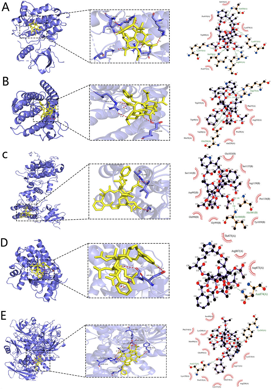 Figure 7. Representative binding poses of the optimal TWP ligands in the active sites of core targets. (A) EGFR-Wilfordinine A; (B) JAK1-Mayteine; (C) JAK2-Wilfordinine F; (D) PTPN11-Wilfornine A; (E) SRD5A1-Euojaponine D. Left panels: overall protein cartoon (blue) with ligand (yellow sticks) and binding-site box (dashed line). Middle panels: close-up 3D interactions (hydrogen bonds as dashed yellow lines, distances in Å). Right panels: 2D interaction diagrams.