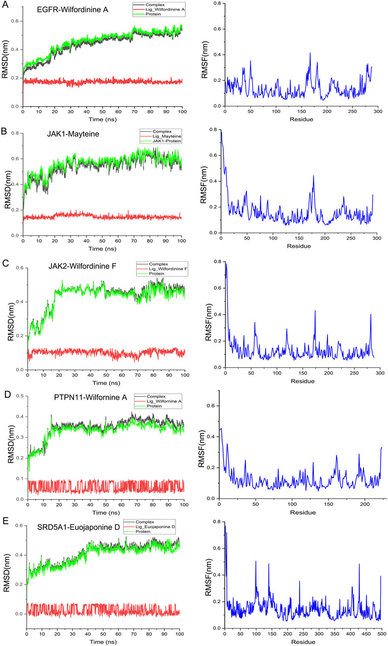 Figure 8. MD stability analyses of the five optimal TWP–target complexes. (A) EGFR-Wilfordinine A; (B) JAK1-Mayteine; (C) JAK2-Wilfordinine F; (D) PTPN11-Wilfornine A; (E) SRD5A1-Euojaponine D; Left panels: RMSD evolution of the complex (black), protein (green) and ligand (red). Right panels: per-residue RMSF (blue).