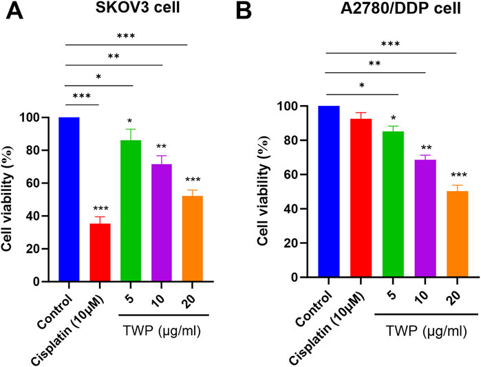 Figure 9. TWP inhibits ovarian cancer cell viability. (A) SKOV3 and (B) A2780/DDP cells were treated with TWP (5, 10, 20 μg/mL) or cisplatin (10 μM) for 24 h. Data are presented as mean ± SD. *P < 0.05, **P < 0.01,***P < 0.001 by ANOVA with Tukey post hoc test.